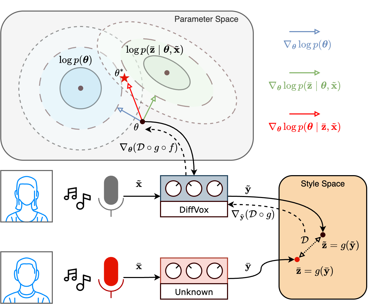 Figure 1: Overview of the proposed calibration method. The prior and the likelihood log-probability densities in the parameter space are represented by two concentric ellipses, coloured blue and green, respectively. Darker colours indicate higher density. The coloured arrows indicate the gradients of the log-probability densities. The red star is the optimal parameters for the vocal effects style transfer.